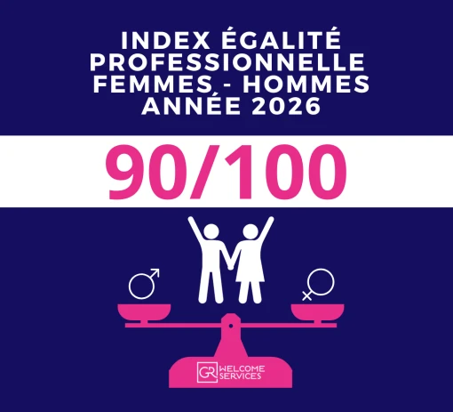 Exigence de justice, l’égalité professionnelle entre les femmes et les hommes est aussi un levier de la performance de l’entreprise. L’index d’égalité professionnelle se compose d'indicateurs qui évaluent les inégalités professionnelles sous la forme d’une note sur 100, sur une période de 12 mois. Chez GR Welcome Services, nous avons mis en place une politique d’égalité qui nous a permis d’obtenir un score de 90/ 100.